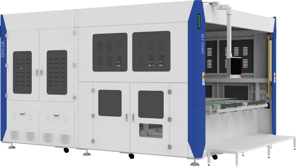 MT300间隙贴膜机是一款能实现在组件玻璃上粘贴串间、片间反光间隙膜的自动化生产设备。