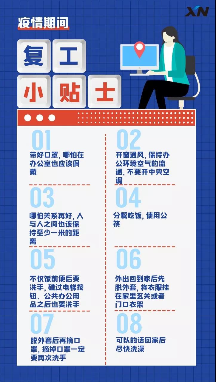 除了以上旨在保护员工身体健康的措施外,小牛还为广大朋友们梳理了一份疫情期间的复工小贴士,希望大家能够在工作中做好防护,保护自己及家人的身体健康。